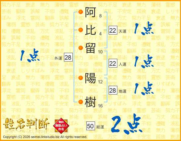 阿(8画)比(4画)留(10画) 陽(12画)樹(16画)
