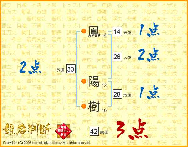 画数の奇数(○陽)と偶数(●陰)の配列で吉凶を占います。どちらかにかたよる名前は大凶名で避ける必要があります。画数の奇数偶数。