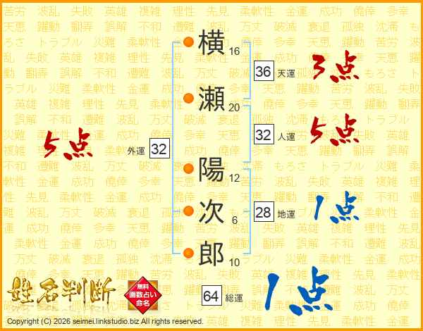 横瀬陽次郎さんの人運は32画の5点!