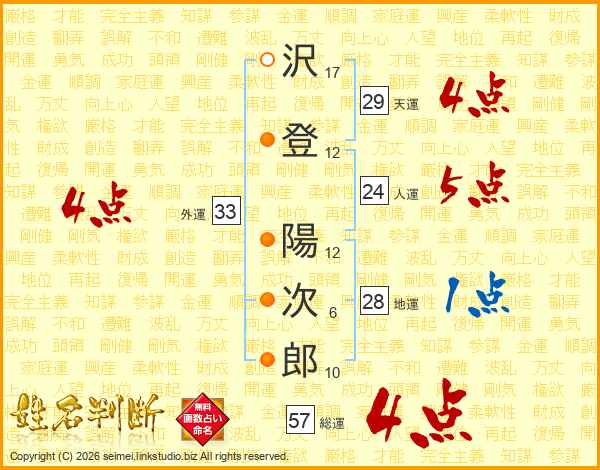 沢(17画)登(12画) 陽(12画)次(6画)郎(10画)