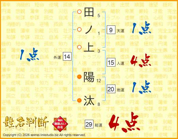 田(5画)ノ(1画)上(3画) 陽(12画)汰(8画)