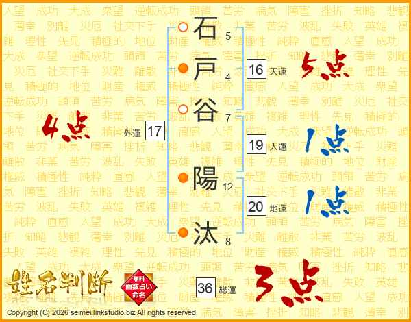 石(5画)戸(4画)谷(7画) 陽(12画)汰(8画)
