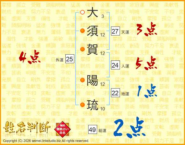 大(3画)須(12画)賀(12画) 陽(12画)琉(10画)