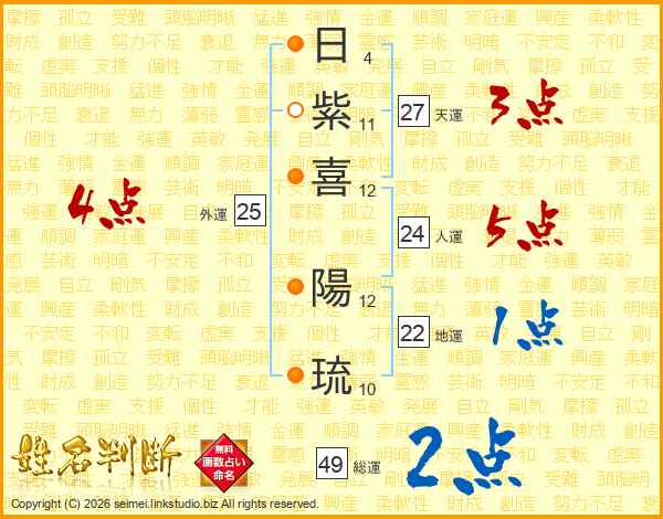日(4画)紫(11画)喜(12画) 陽(12画)琉(10画)