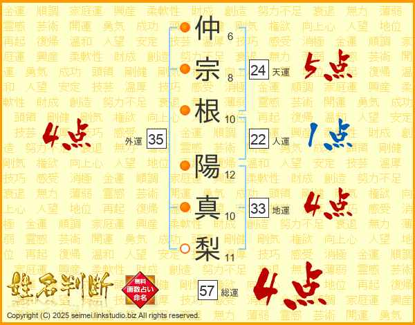 仲(6画)宗(8画)根(10画) 陽(12画)真(10画)梨(11画)