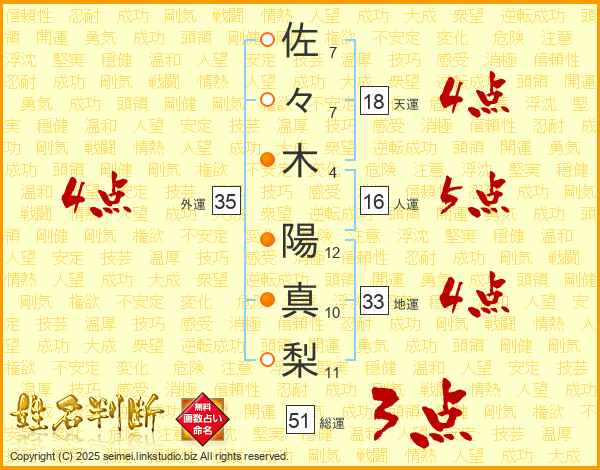 佐(7画)々(7画)木(4画) 陽(12画)真(10画)梨(11画)