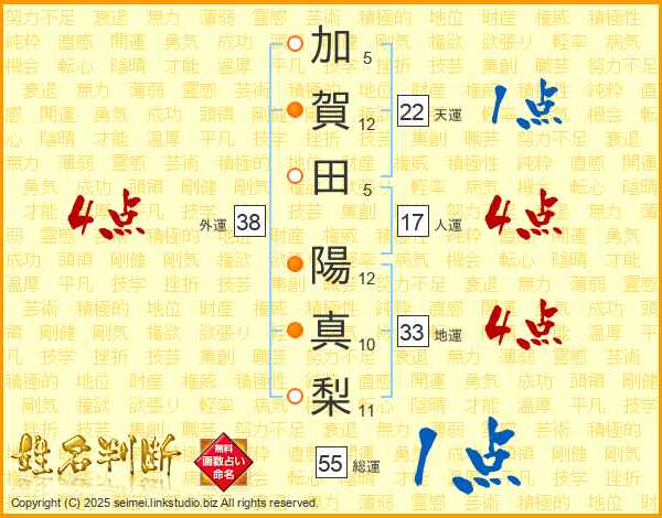 加(5画)賀(12画)田(5画) 陽(12画)真(10画)梨(11画)