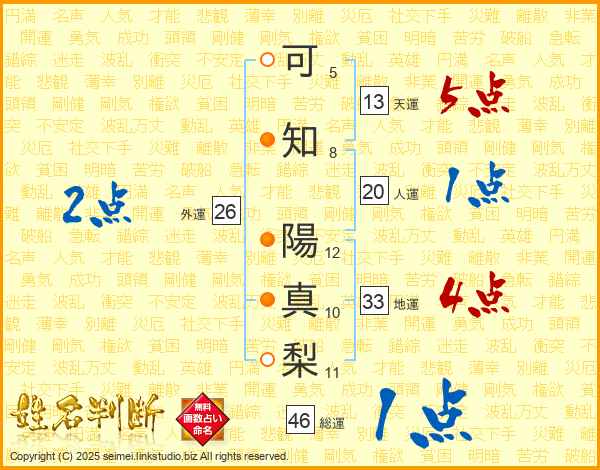 可(5画)知(8画) 陽(12画)真(10画)梨(11画)