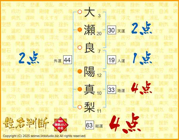 大(3画)瀬(20画)良(7画) 陽(12画)真(10画)梨(11画)