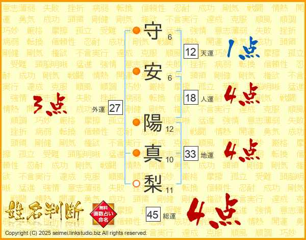 守(6画)安(6画) 陽(12画)真(10画)梨(11画)