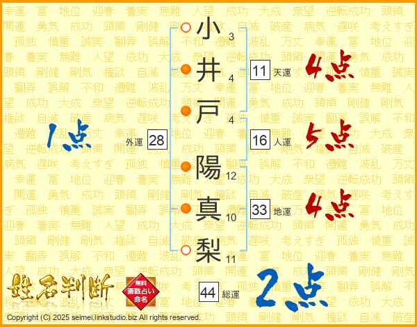 小(3画)井(4画)戸(4画) 陽(12画)真(10画)梨(11画)