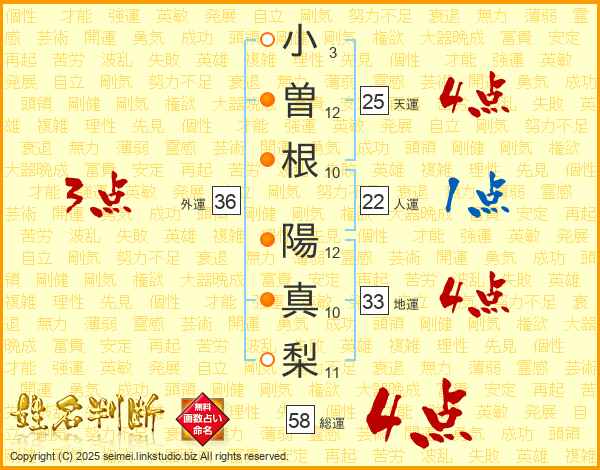 小(3画)曽(12画)根(10画) 陽(12画)真(10画)梨(11画)
