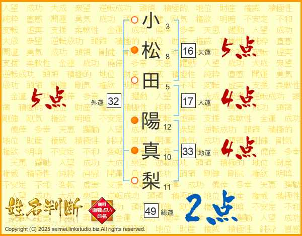 小(3画)松(8画)田(5画) 陽(12画)真(10画)梨(11画)