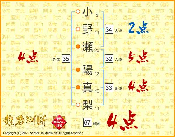 小(3画)野(11画)瀬(20画) 陽(12画)真(10画)梨(11画)