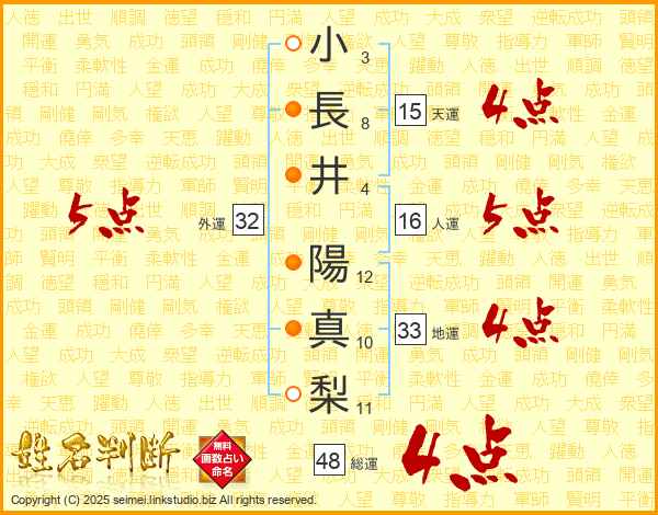 小(3画)長(8画)井(4画) 陽(12画)真(10画)梨(11画)