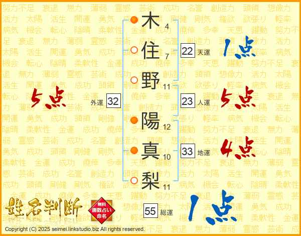 木(4画)住(7画)野(11画) 陽(12画)真(10画)梨(11画)