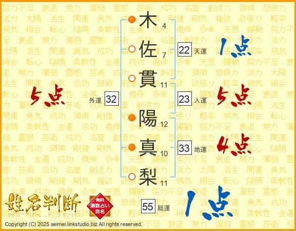 木(4画)佐(7画)貫(11画) 陽(12画)真(10画)梨(11画)