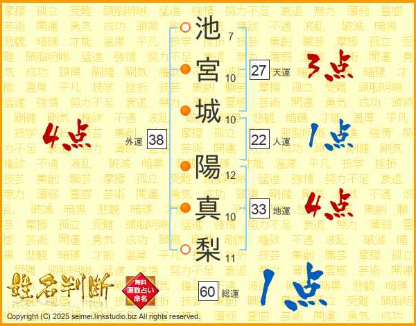 池(7画)宮(10画)城(10画) 陽(12画)真(10画)梨(11画)