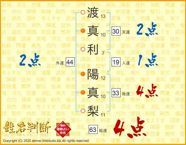 渡(13画)真(10画)利(7画) 陽(12画)真(10画)梨(11画)