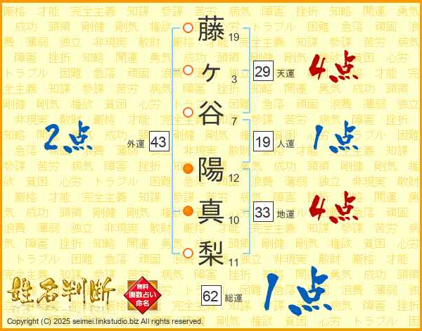 藤(19画)ヶ(3画)谷(7画) 陽(12画)真(10画)梨(11画)