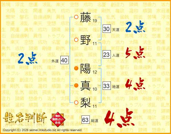藤(19画)野(11画) 陽(12画)真(10画)梨(11画)