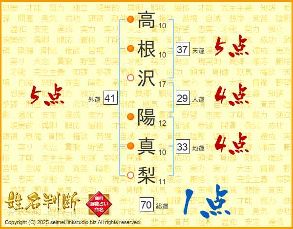 高(10画)根(10画)沢(17画) 陽(12画)真(10画)梨(11画)