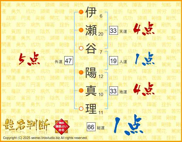 伊(6画)瀬(20画)谷(7画) 陽(12画)真(10画)理(11画)