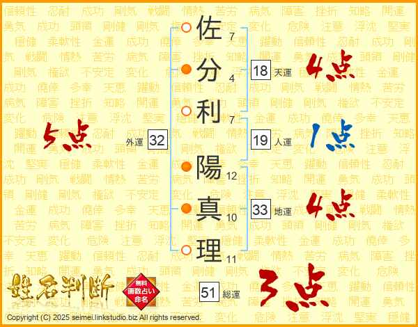 佐(7画)分(4画)利(7画) 陽(12画)真(10画)理(11画)