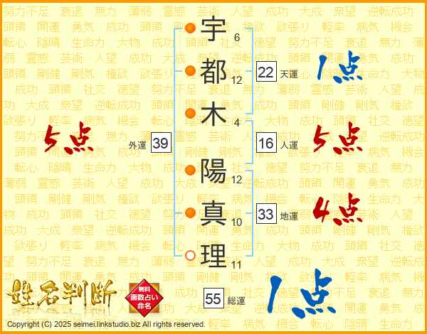 宇(6画)都(12画)木(4画) 陽(12画)真(10画)理(11画)