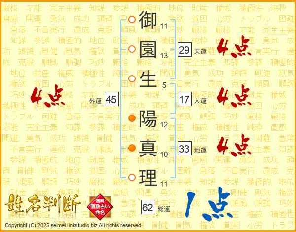 御(11画)園(13画)生(5画) 陽(12画)真(10画)理(11画)