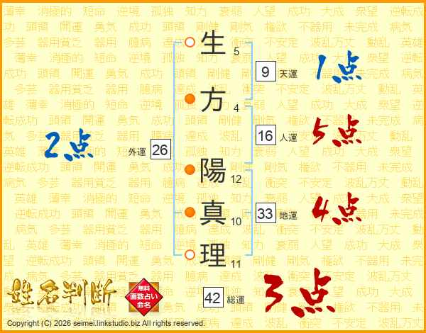 生(5画)方(4画) 陽(12画)真(10画)理(11画)