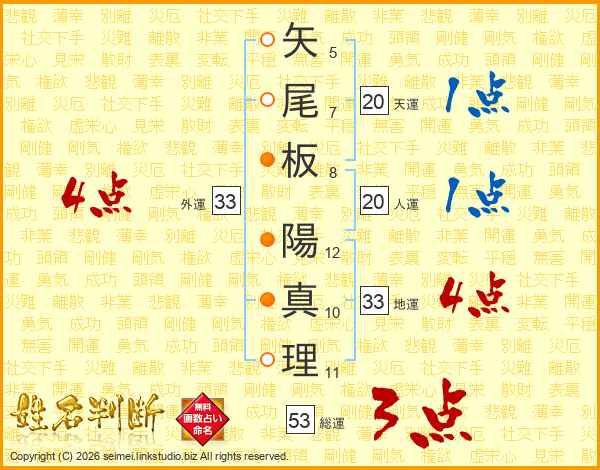 矢(5画)尾(7画)板(8画) 陽(12画)真(10画)理(11画)