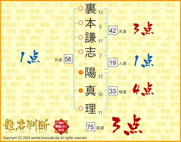 裏(13画)本(5画)謙(17画)志(7画) 陽(12画)真(10画)理(11画)