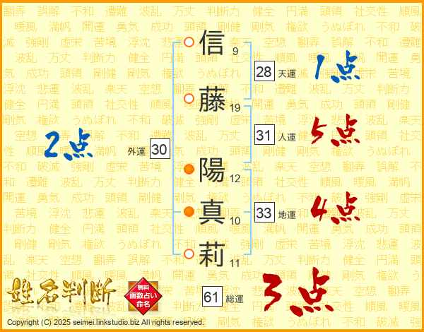 信(9画)藤(19画) 陽(12画)真(10画)莉(11画)