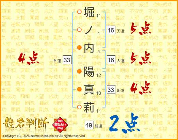 堀(11画)ノ(1画)内(4画) 陽(12画)真(10画)莉(11画)