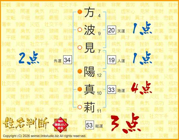 方(4画)波(9画)見(7画) 陽(12画)真(10画)莉(11画)