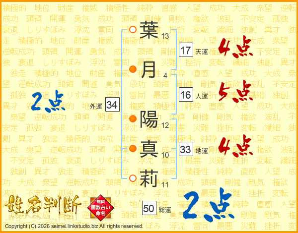 葉(13画)月(4画) 陽(12画)真(10画)莉(11画)