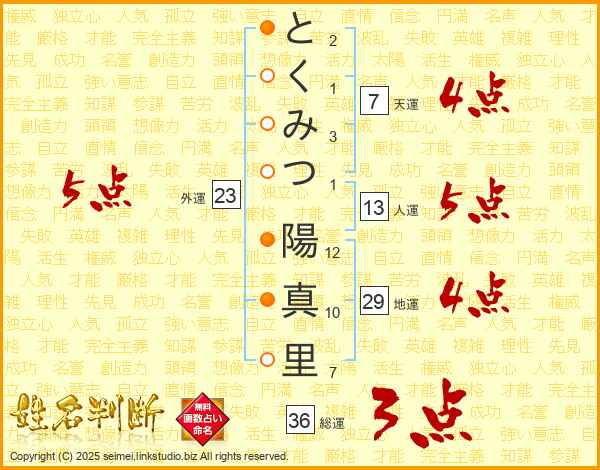 と(2画)く(1画)み(3画)つ(1画) 陽(12画)真(10画)里(7画)