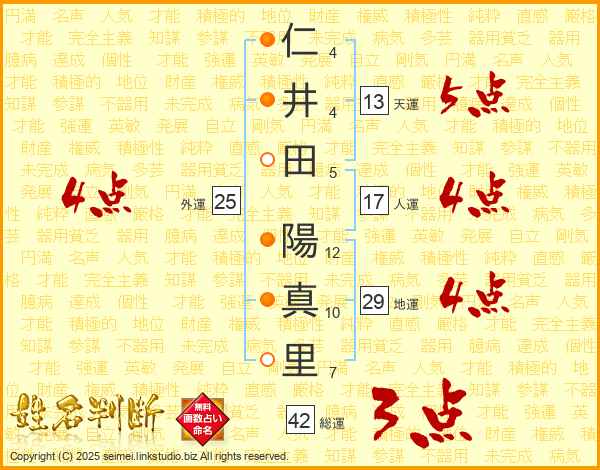 仁(4画)井(4画)田(5画) 陽(12画)真(10画)里(7画)
