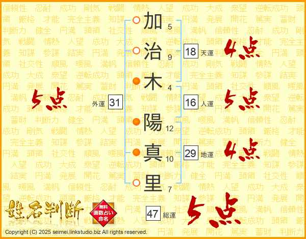 加(5画)治(9画)木(4画) 陽(12画)真(10画)里(7画)