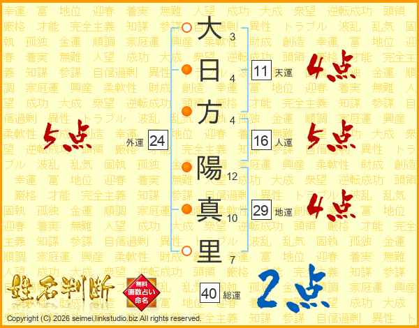 大(3画)日(4画)方(4画) 陽(12画)真(10画)里(7画)