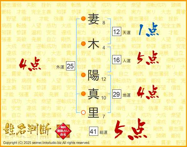 妻(8画)木(4画) 陽(12画)真(10画)里(7画)