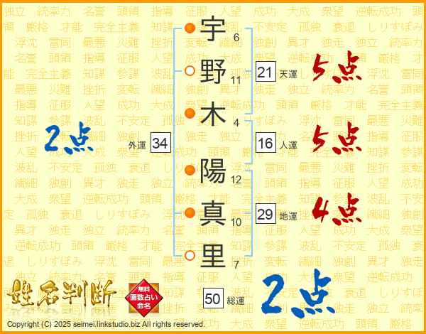 宇(6画)野(11画)木(4画) 陽(12画)真(10画)里(7画)