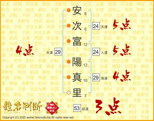 安(6画)次(6画)富(12画) 陽(12画)真(10画)里(7画)