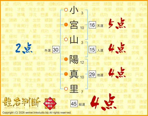 小(3画)宮(10画)山(3画) 陽(12画)真(10画)里(7画)