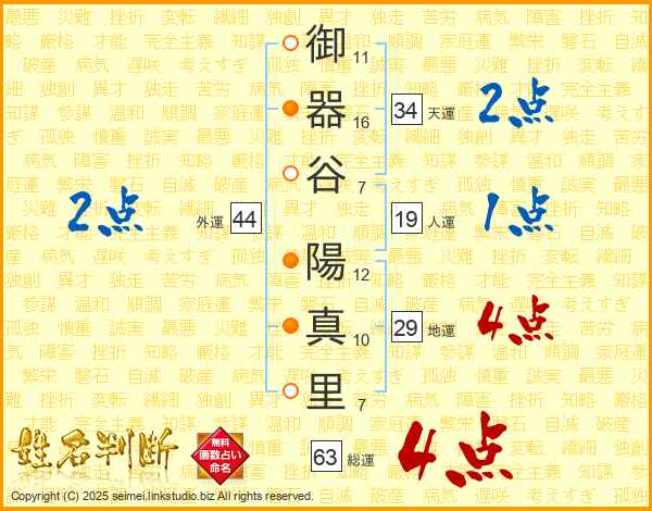 御(11画)器(16画)谷(7画) 陽(12画)真(10画)里(7画)