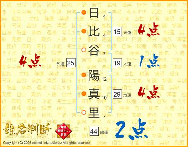 日(4画)比(4画)谷(7画) 陽(12画)真(10画)里(7画)