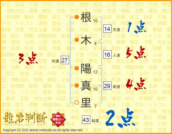 根(10画)木(4画) 陽(12画)真(10画)里(7画)