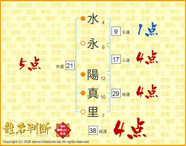 水(4画)永(5画) 陽(12画)真(10画)里(7画)
