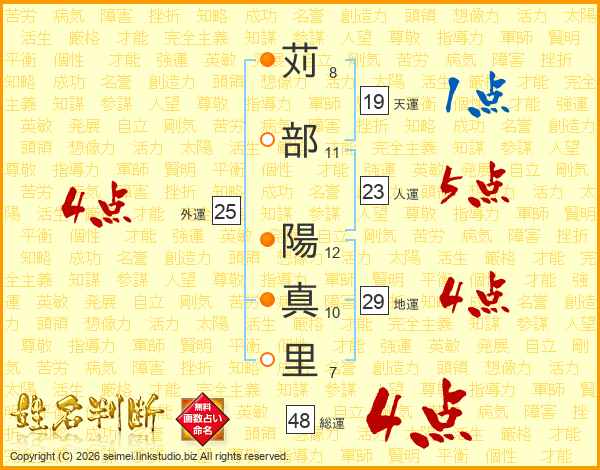 生活面を象徴する運勢です。外部から受ける影響力を表し、結婚運、家庭運や職場、環境への順応性を表します。総運から人運を引いた画数。姓や名が1文字の場合を除く。